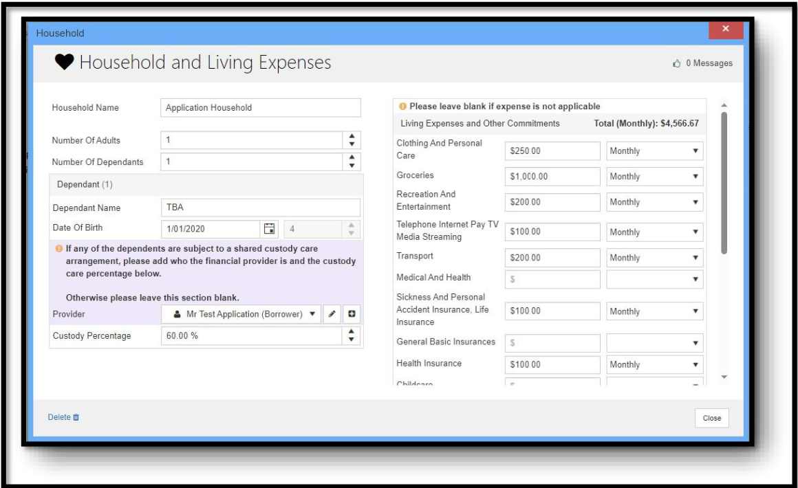 4. Living expenses: Enter the customer's declared living expenses into the living expenses section. The customer must also include provision for expenses related to caring for the child 60% of the time in their declared living expenses.