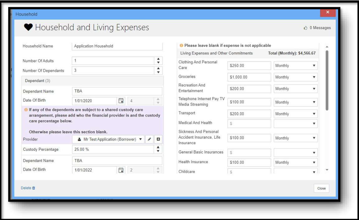 4. Living expenses: Enter the customer's declared living expenses into the living expenses section. The customer must also include provision for expenses related to caring for the three children at the time in their declared living expenses.
