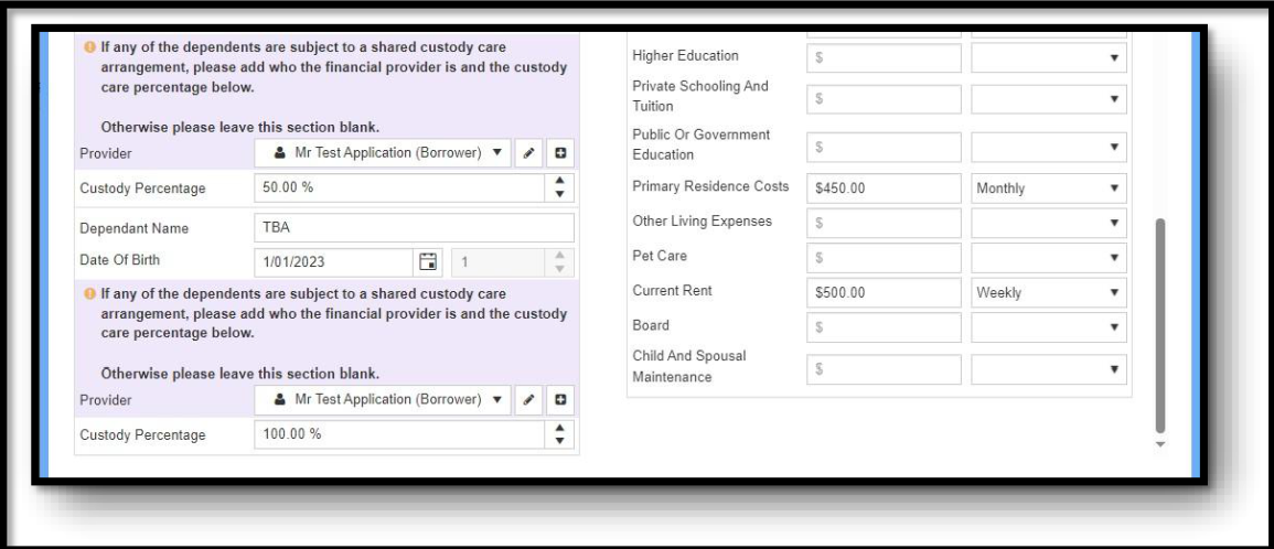 4. Living expenses: Enter the customer's declared living expenses into the living expenses section. The customer must also include provision for expenses related to caring for the child 40% of the time in their declared living expenses.